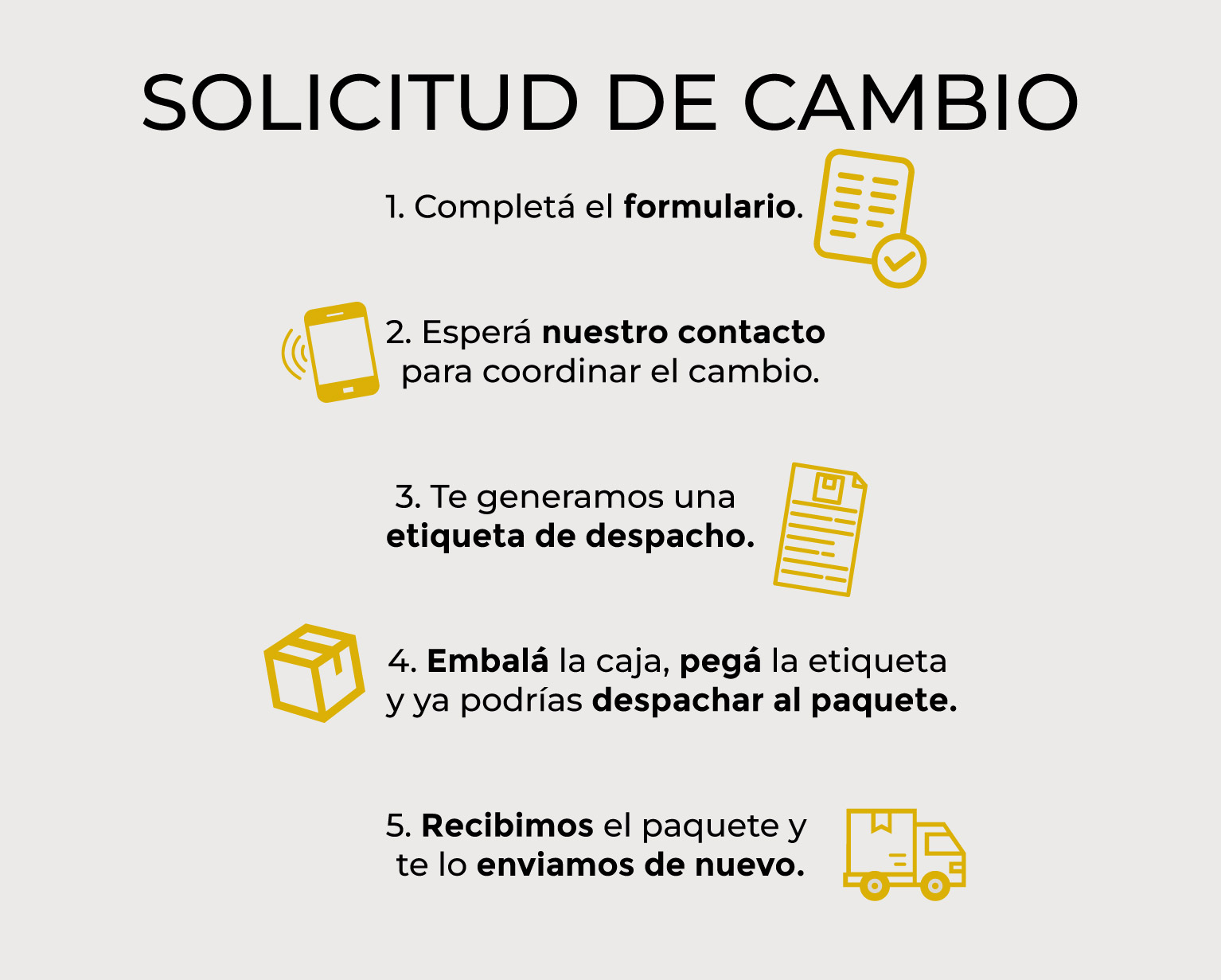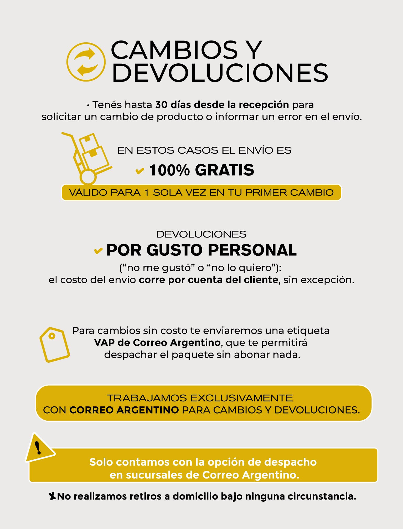 CAMBIOS: Todo artículo adquirido que no sea de la completa satisfacción el consumidor puede ser cambiado en un plazo máximo de treinta (30) días corridos contados a partir de la fecha de recepción del pedido. Los Productos deberán encontrarse en el mismo estado en que fueron remitidos, sin haber sido utilizados, y con el embalaje y etiquetas originales en buen estado.